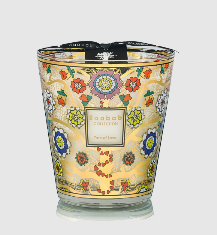 La bougie parfumée Tree of Love se distingue par son élégante sérigraphie dorée et multicolore, inspirée de l’iconographie des arbres de vie. Ses branches dorées sont ornées d’une profusion de fleurs dont les pétales en forme de cœur s’entrelacent.